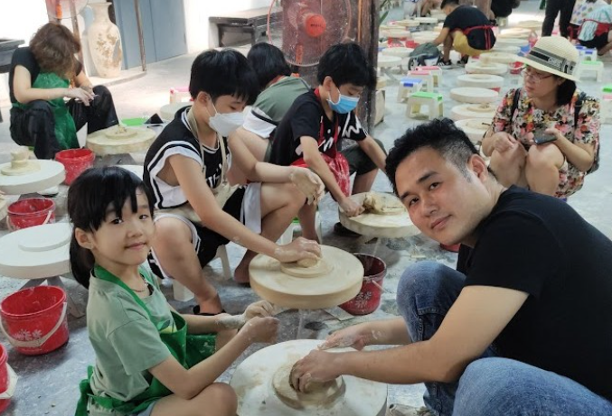 Du khách thực hành làm gốm tại làng gốm Bát Tràng - Ảnh: Chu Hoài