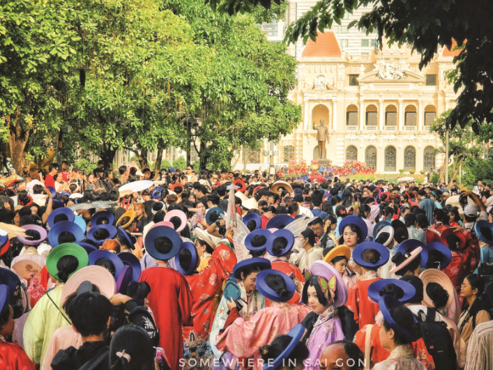 Đoàn bộ hành cổ phục đi qua những công trình kiến trúc - điểm tham quan du lịch của TP. HCM. Ảnh: Lê Tiến