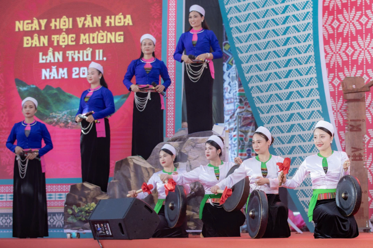 Một tín hiệu đáng mừng là thời gian gần đây, trang phục Mường đang hiện diện ngày càng rõ nét và lan tỏa mạnh trong các không gian sinh hoạt cộng đồng quy mô lớn. Tại nhiều lễ hội, ngày hội VHTTDL được tổ chức bài bản, thu hút đông đảo người tham dự, đồng bào Mường ở Sơn La, Lào Cai, Thanh Hóa, Phú Thọ đã chủ động giới thiệu bản sắc của mình. Đáng chú ý, trang phục không còn xuất hiện đơn lẻ mà được đặt trong một chuỗi hoạt động giàu chiều sâu: trình diễn nghề dệt, trình diễn trang phục, tái hiện không gian văn hóa, trưng bày sản phẩm và thuyết minh về kỹ thuật, chất liệu, ý nghĩa hoa văn. Khi người Mường khoác trang phục truyền thống bước ra trước đông người, bộ váy áo trở thành một “ngôn ngữ kể chuyện” về đôi bàn tay khéo léo dệt nên thổ cẩm, về nếp nhà, lễ tục và chuẩn mực của cộng đồng, qua đó giúp bản sắc văn hóa lan tỏa mạnh mẽ, rộng rãi hơn trong đời sống đương đại.